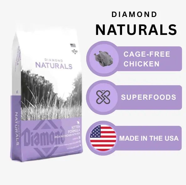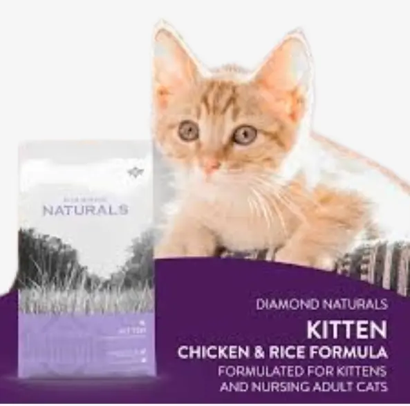 Diamond Kitten Food provides balanced nutrition for growing kittens, supporting healthy development, strong bones, shiny coats, and a robust immune system with high-quality proteins and essential nutrients.